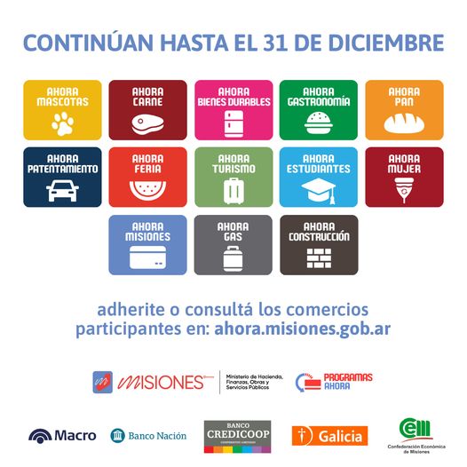 De esta manera, siguen vigentes hasta fin de año los Programas; Ahora Misiones, Ahora Bienes Durables, Ahora Carne, Ahora Pan, Ahora Estudiantes, Ahora Gastronomía, Ahora Mascotas, Ahora Feria, Ahora Patentamiento, Ahora Turismo, Ahora Gas, Ahora Mujer y Ahora Pan. También continúan los nuevos Programas Ahora Construcción y Ahora Viajá por Misiones.
