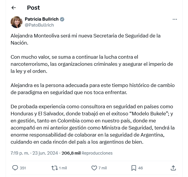 “Alejandra Monteoliva será mi nueva Secretaria de Seguridad de la Nación. Con mucho valor, se suma a continuar la lucha contra el narcoterrorismo, las organizaciones criminales y asegurar el imperio de la ley y el orden”, escribió la Ministra a través de su cuenta de X (ex Twitter).