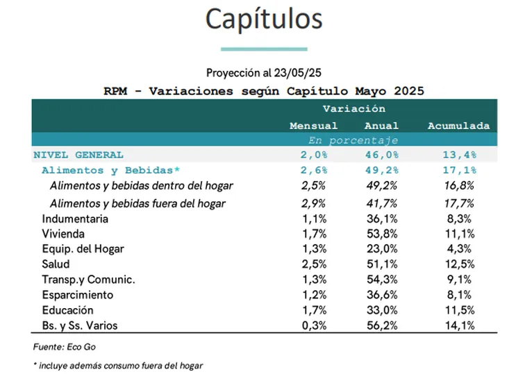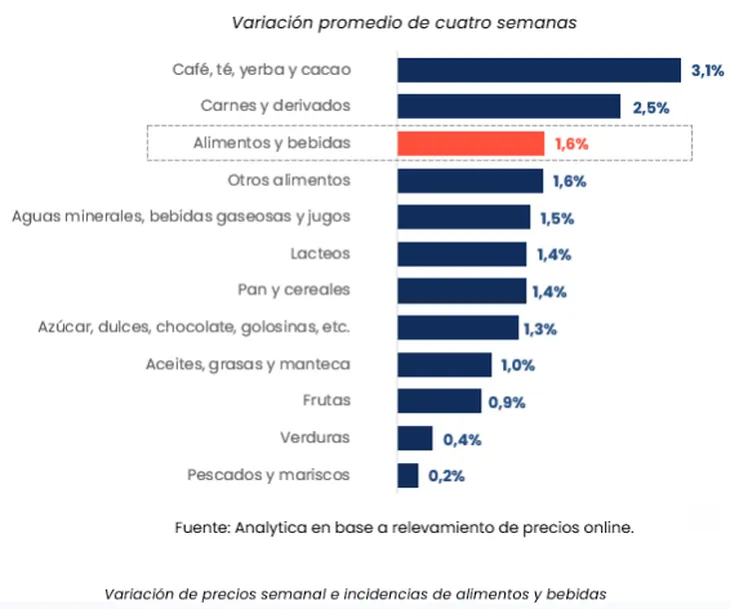 Por su parte, para Analytica, el IPC general va a exhibir un avance del 2,1% en mayo. Su último análisis, correspondiente a la tercera semana de mayo, dio como resultado un aumento de 1,6% en alimentos para el promedio de las últimas cuatro semanas.