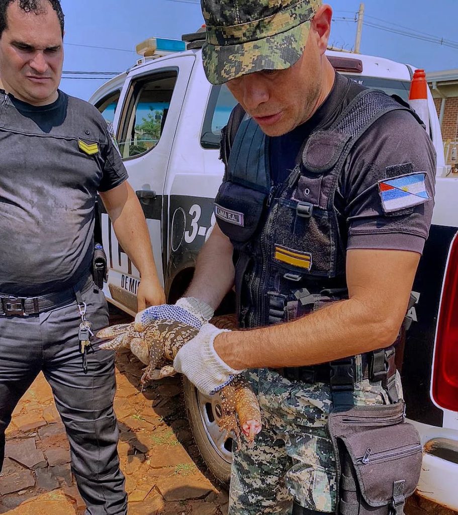 En otro procedimiento similar, los efectivos de la Dirección Defensa del Medioambiente se dirigieron al barrio Sol de Misiones de la ciudad de Posadas. Allí, un vecino explicó que en su domicilio había hallado a un lagarto overo, por lo que el personal lo puso a salvo y posteriormente, lo devolvió a una zona segura.