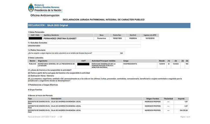 Última DDJJ presentada por Cristina Fernández de Kirchner tras dejar la Vicepresidencia de la Nación