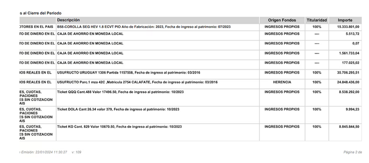 Además, dijo tener 1.744.271 pesos en cuatro cajas de ahorro en el país, y bienes del hogar por 1.843.496 pesos. No declaró dinero en el exterior ni deudas. Como ingresos anuales durante 2023, informó 97.727.008 pesos, y gastos personales por 82.109.709 pesos.