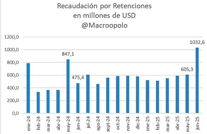 Según estimaciones del economista de Cohen Martín Polo, la recaudación de retenciones en junio por la aceleración de las declaraciones juradas y la liquidación de divisas fue de unos 1.032 millones de dólares, una cifra récord en los últimos meses. Son, como referencia, unos 400 millones de dólares más que en junio y más que los casi 850 millones de dólares en Mayo del año pasado, es decir durante la cosecha gruesa del primer año de Gobierno del Presidente Javier Milei, con un tipo de cambio multilateral más alto que el actual.