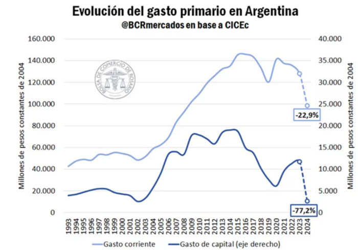 Con ese dato como punto de partida, la Bolsa de Comercio de Rosario (BCR) elaboró un informe explicando el escenario condujo a esa situación. En ese contexto, destacaron que la asunción de un nuevo gobierno en diciembre de 2023 marcó un abrupto cambio en la política económica de Argentina. “Con el foco puesto en detener la emisión monetaria para combatir la inflación, que llegó a situarse en más del 25% mensual en diciembre de aquel año, comenzó un proceso de saneamiento de las cuentas públicas para lograr el equilibro fiscal”, señalaron.