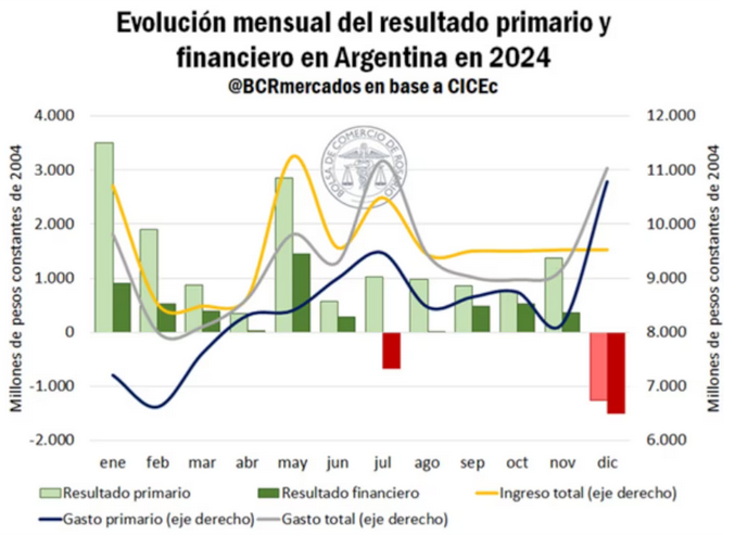 Por el contrario, en 2024, únicamente en dos meses se observaron cuentas en negativo: en julio, cuando a pesar de lograrse un superávit primario se evidenció un déficit financiero por 675 millones de pesos, debido principalmente a la carga de intereses de la deuda pública que operó durante ese mes, y en Diciembre, cuando tanto el resultado fiscal como el financiero se ubicaron en terreno negativo por 1.250 millones de pesos y 1.500 millones de pesos, respectivamente. “En este último caso, este resultado responde a un aumento estacional en el gasto público relacionado fundamentalmente al pago de aguinaldos y asignaciones extraordinarias”, explicaron los especialistas de la Bolsa de Comercio de Rosario.
