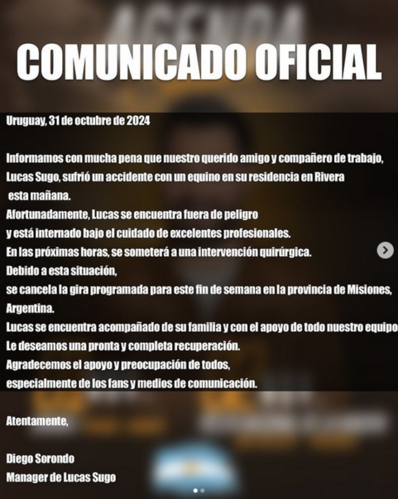 El cantante uruguayo debía presentarse este viernes en UMMA, a raíz del accidente Diego Sorondo, manager de Lucas Sugo difundió en las redes personal del artista el siguiente comunicado.