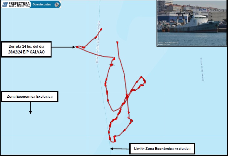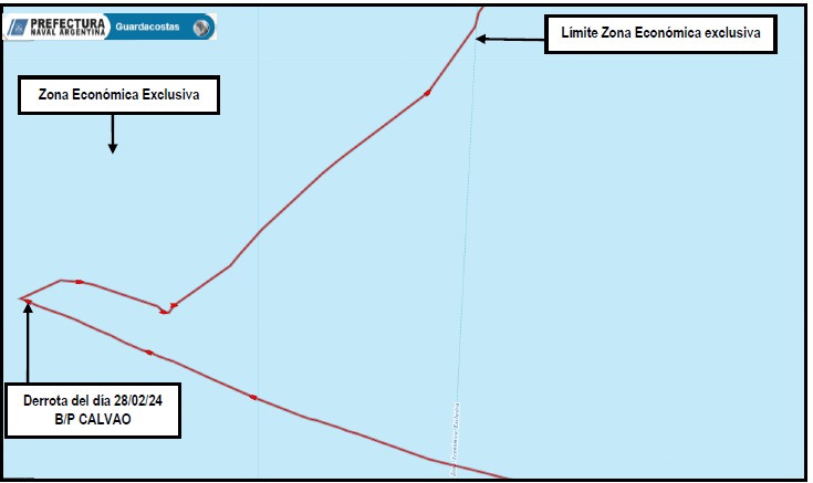 Personal especializado de la Prefectura Naval Argentina detectó al buque pesquero Calvao, de bandera Portugal, que estaría pescando ilegalmente dentro de la Zona Económica Exclusiva argentina, en una clara infracción a la Ley N° 24.922 “Régimen Federal de Pesca”.
