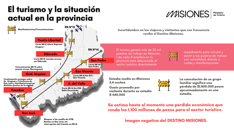 Las manifestaciones que se han intensificado en las últimas semanas a través de diferentes cortes de ruta en la provincia de Misiones, afectan directamente a diversos sectores de la economía provincial. Uno de ellos, es el turismo, que presenta una baja en el movimiento de visitantes y, por lo tanto, de reservas, de excursiones, de consumos, de paseos, de inversión económica, estimando la pérdida, al día de hoy, en una cifra superior a los 1.100 millones de pesos.