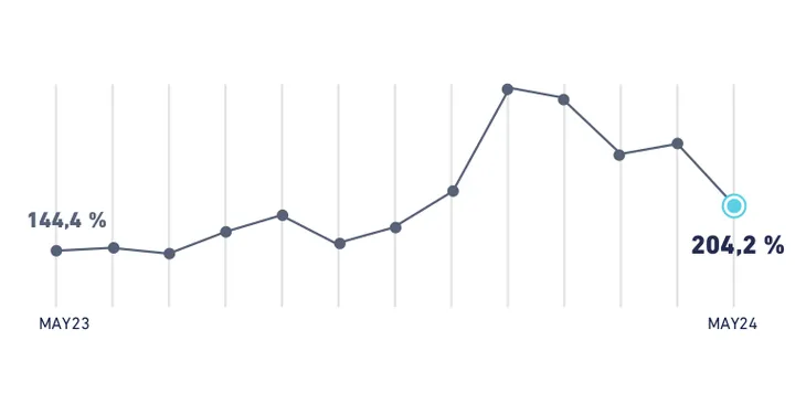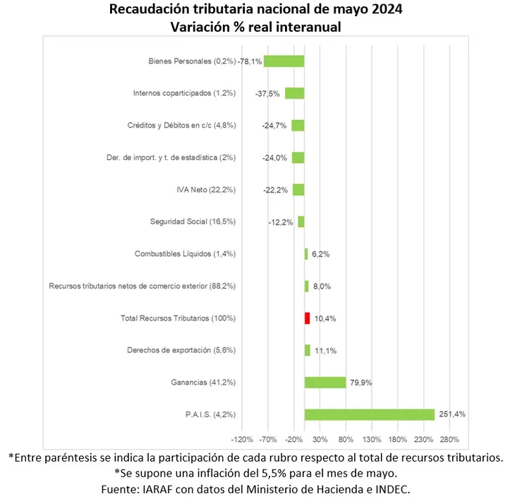 Según se señaló desde el Instituto Argentino de Análisis Fiscal (IARAF) , "luego de 8 meses consecutivos de caída real interanual, en el mes de mayo de 2024 la recaudación tributaria nacional habría subido un 10% real interanual". Al excluir la recaudación por tributos vinculados al comercio exterior, la suba sería del 8%.