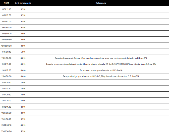 En tanto, de acuerdo con su posición arancelaria en la Nomenclatura Común del Mercosur (NCM), los derivados de estos granos, como harinas, sémolas y pellets, abonarán una alícuota de entre 3,5% y 7%, conforme surge del anexo incluido en el decreto.