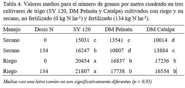 En la tabla 4 se presentan los valores medios correspondientes a la variable “número de grano por metro cuadrado”. Independientemente del cultivar, el número de granos fue mayor cuando el cultivo recibió riego suplementario. Por otra parte, la fertilización nitrogenada no incidió significativamente sobre el número de granos en ninguno de los tres cultivares. En secano, el valor medio del material fertilizado resultó significativamente mayor al del no fertilizado en los cultivares SY 120 y DM Catalpa. Por el contrario, el cultivar DM Pehuén presento un mayor número de granos en el material no fertilizado.