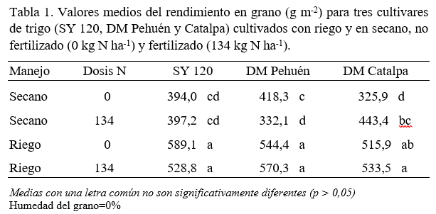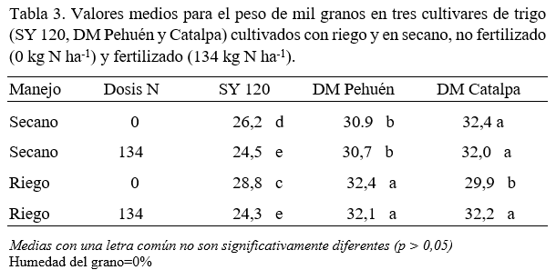 En la tabla 3 se presentan los valores medios para el peso de mil granos en los tres cultivares de trigo evaluados con y sin riego suplementario, fertilizados o no con urea a la siembra. La variedad comercial DM Pehuén puso de manifiesto una clara tendencia respecto a la variable objeto de análisis. El peso del grano fue mayor cuando el cultivo se regó, sin embargo, la fertilización nitrogenada no incidió significativamente sobre éste.