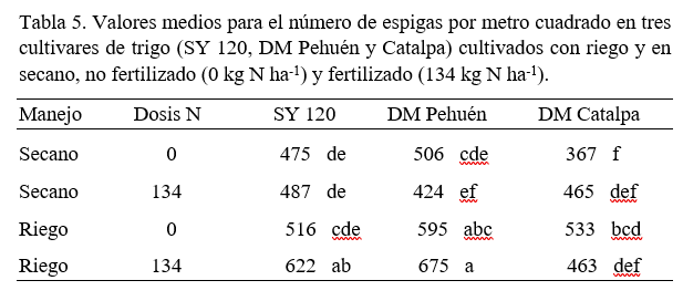 Finalmente, los valores medios correspondientes a la variable “número de espigas por metro cuadrado” se presentan en la tabla 5. Analizando en primera instancia los resultados obtenidos en el cultivar SY 120, el número de espigas en el tratamiento “riego suplementario + 134 kg N ha-1” resultó significativamente superior al de las restantes combinaciones de tratamientos. Sin profundizar demasiado en la interpretación de los resultados obtenidos para los dos cultivares de Don Mario, valga la siguiente reflexión al analizar las combinaciones de tratamientos “riego suplementario + 134 kg N ha-1” y “secano + 134 kg N ha-1”. En DM Pehuén el riego potenció el efecto de la nutrición mineral, en DM Catalpa no.