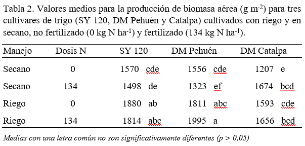 La interpretación de la interacción de segundo orden para la variable “biomasa aérea” no es tan directa como en el caso del rendimiento en grano (Tabla 2). En el caso de la variedad SY 120, el valor medio del material fertilizado no difirió del no fertilizado ya sea en secano como con riego. Algo similar aconteció con el cultivar DM Pehuén. En cuanto al comportamiento de la variedad DM Catalpa cultivada en secano, la producción de biomasa aérea fue significativamente mayor cuando el material se fertilizó.