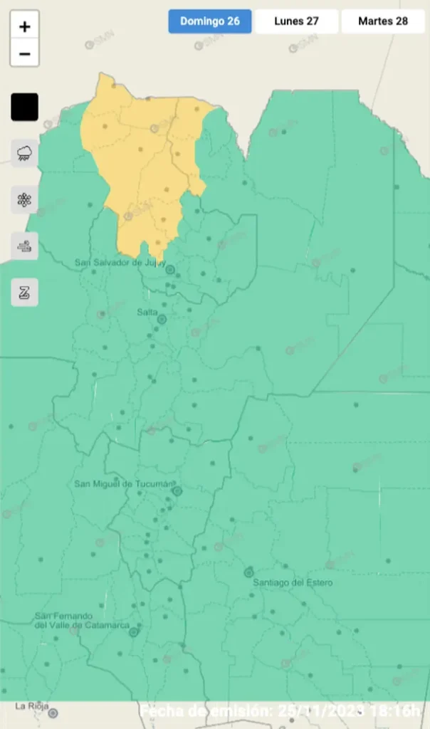 Se trata de un alerta amarillo que rige para zonas de Jujuy y Salta. Además, un aviso de igual características pero por vientos fuertes afectaba a regiones de Santa Cruz y Tierra del Fuego.