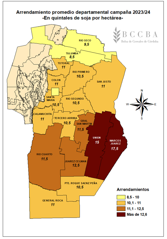 La primera estimación de arrendamientos para la campaña 2023/24 24 llevada a cabo desde la Bolsa de Cereales de Córdoba, arrojó un resultado promedio para la provincia de 11,5 quintales de soja por hectárea, medio quintal por debajo del observado en la campaña 2022/23 (12 qq/ha), pero posicionándose como el segundo valor más alto de las últimas 12 campañas.