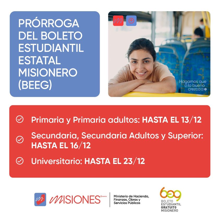 Tal como anunció el Gobernador de la provincia de Misiones, Oscar Herrera Ahuad días atrás, recordamos que el Boleto Estudiantil Estatal Misionero BEEM) extenderá su vigencia para acompañar a los estudiantes de distintos niveles en la terminación del ciclo lectivo:
