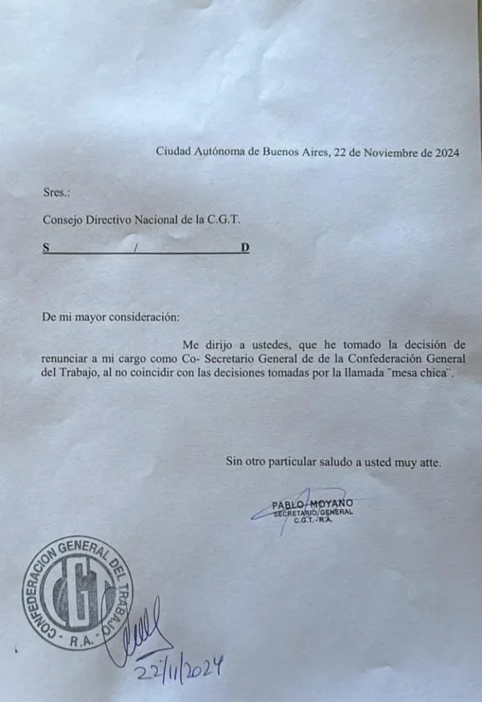 Moyano renunció a su cargo en la CGT a través de una breve nota enviada al Consejo Directivo de la central. Hacía un tiempo que venía pidiendo mantener un plan de lucha contra el ajuste libertario, pero en el último tiempo primó la postura dialoguista.