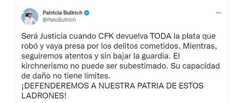 Tuit de Patricia Bullrich sobre la condena a Cristina Kirchner
