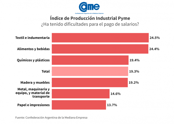 Por último, en diferentes sectores industriales se consultó si la PyME tuvo dificultades para afrontar el pago de salarios del mes en curso. Allí, el 19,3% de las industrias pyme presentaron problemas para pagar salarios (sin incluir aguinaldo u otros conceptos). Los sectores más afectados fueron “Textil e indumentaria” y “Alimentos y Bebidas” con tasas de dificultades del orden del 24,5% y 24,4%, respectivamente. “Papel e impresiones” presentó los menores conflictos, con 13,7%.