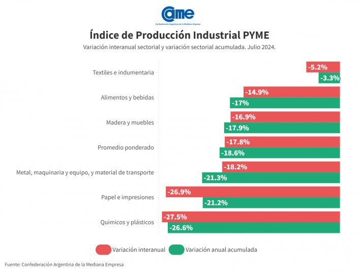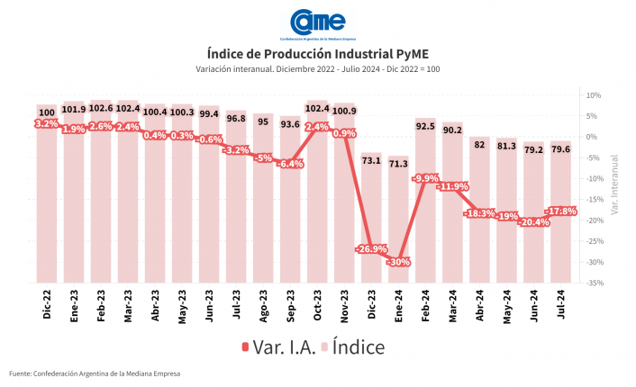 La actividad manufacturera de las PyMEs cayó 17,8% anual en el mesa de Julio y acumula una retracción de 18,6% en los siete meses del año frente al mismo período de 2023. En la comparación mensual desestacionalizada la producción bajó 1,8%.
