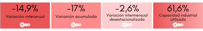 El sector tuvo una contracción anual de 18,2% en Julio a precios constantes y de 0,5% en la comparación mensual desestacionalizada. En estos siete meses del año acumula una caída de 21,3% frente a los mismos meses de 2023. Las industrias operaron al 59,1% de su capacidad instalada y el 14,6% de los encuestados tuvo problemas para pagar salarios.
