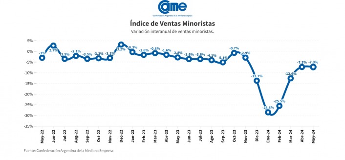 Las ventas minoristas PyMEs retrocedieron 7,3% anual en Mayo, a precios constantes, y acumulan una caída de 16,2% en los primeros cinco meses del año. En la comparación mensual desestacionalizada, crecieron 6,6%.