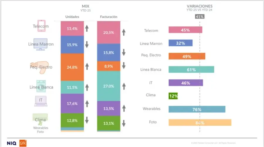 Los celulares protagonizan la categoría más vendida en unidades y facturación dentro del sector IT, con una suba de 46% en unidades, ganan 5 puntos de participación los dispositivos con precio promedio en dólares mayor a u$s400, mientras que 50% de modelos vendidos en 2025 son ítems nuevos. Para cerrar, la venta de televisores creció 42% en unidades, motorizada por el rango de 54 a 60 pulgadas. El 38% de modelos vendidos en 2025 también son ítems nuevos.