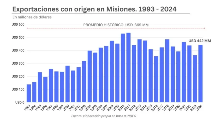 En términos absolutos, Misiones lideró las exportaciones dentro del NEA, representando el 39% del total de la región. Además, los 442 millones de dólares exportados en 2024 superaron en 19,8% el promedio histórico de la provincia entre 1994 y 2023.