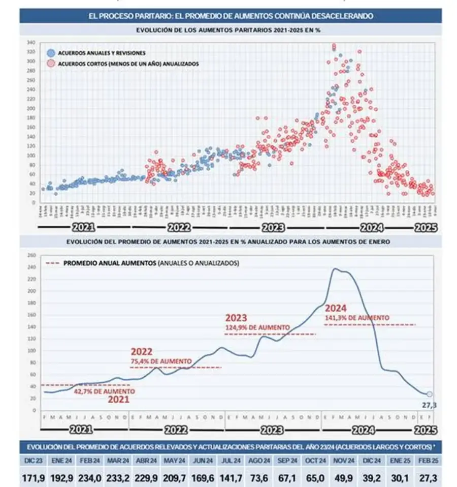 La dinámica anual de aumentos paritarios promedio se ubicó en Febrero de este año en 27,3%, el nivel más bajo de toda la serie iniciada en Enero de 2021.