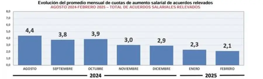 El promedio mensual de aumentos salariales en los acuerdos paritarios ha venido bajando sistemáticamente desde que Synopsis lleva este registro en agosto del año pasado, cuando era de 4,4% mensual en tanto que en Febrero último se ubicó en 2,1%.