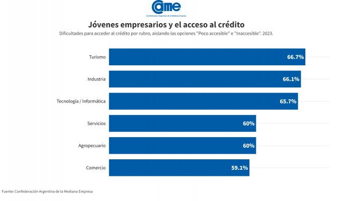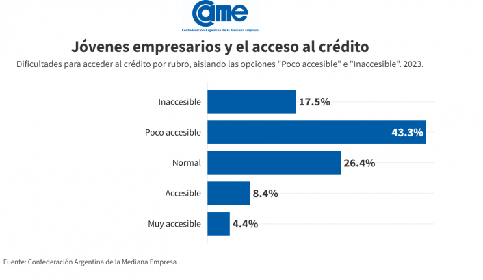 Una encuesta realizada por el sector Joven de la Confederación Argentina de la Mediana Empresa (CAME) determinó que seis de que cada diez empresarios argentinos de entre 18 y 40 años tiene dificultades o le resulta imposible acceder al financiamiento productivo. Se trata de un segmento etario con falta de capital de respaldo y de flujo de fondos para invertir.