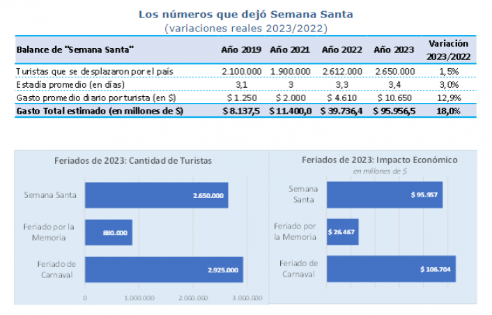 Semana Santa es uno de los fines de semana largos más importantes del año para el turismo y esta ocasión no defraudó: 2.650.000 personas viajaron por el territorio nacional y gastaron $95.957 millones en alimentos, bebidas, alojamiento, transporte, recreación y compras diversas.