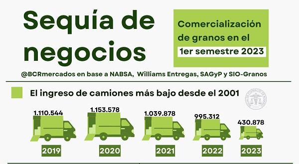 “En los últimos 20 años, el peor registro de descarga acumulada ente Enero y Junio inclusive lo ostentaban el primer semestre de 2014, con 22,1 millones de toneladas, y el primer semestre de 2012 cuando se entregaron, estimativamente, 24 millones de toneladas de granos por camión”, resumieron las investigadoras.