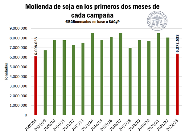 Por último, en un reporte paralelo del que participa Terré, pero junto a María Belén Maldonado y Tomás Rodríguez Zurro, la BCR indicó que la molienda de soja en los dos primeros meses de la campaña comercial 2022/23 fue la más baja en 15 años.