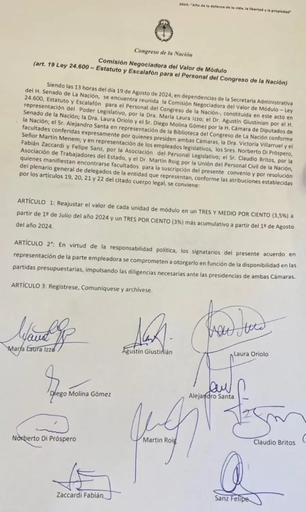 La resolución lleva la firma de las autoridades del Senado, María Laura Izzo, secretaria administrativa, y Agustín Giustinian, secretario parlamentario. Por Diputados Laura Oriolo, secretaria administrativa y Diego Molina Gómez, secretario general de Diputados y los sectores sindicales. Norberto Di Prospero y Fabián Zacardi de parte de la Asociación del Personal Legislativo (APL), Claudio Britos de ATE y Martín Roig de Unión del Personal Civil de la Nación.