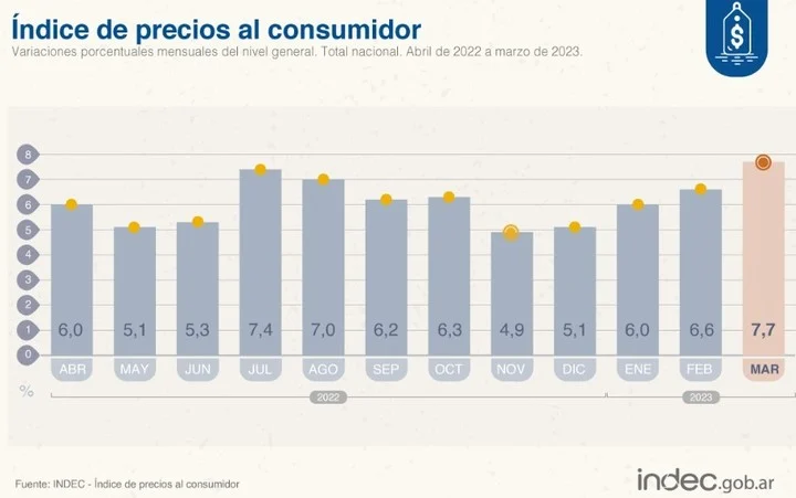 La inflación continuó en alza y en Marzo se registró una suba de precios del 7,7% con respecto a febrero. Con el dato oficial publicado este viernes por el Instituto Nacional de Estadística y Censos (Indec), la variación interanual llega al 104,3%, la más alta en más de 30 años.