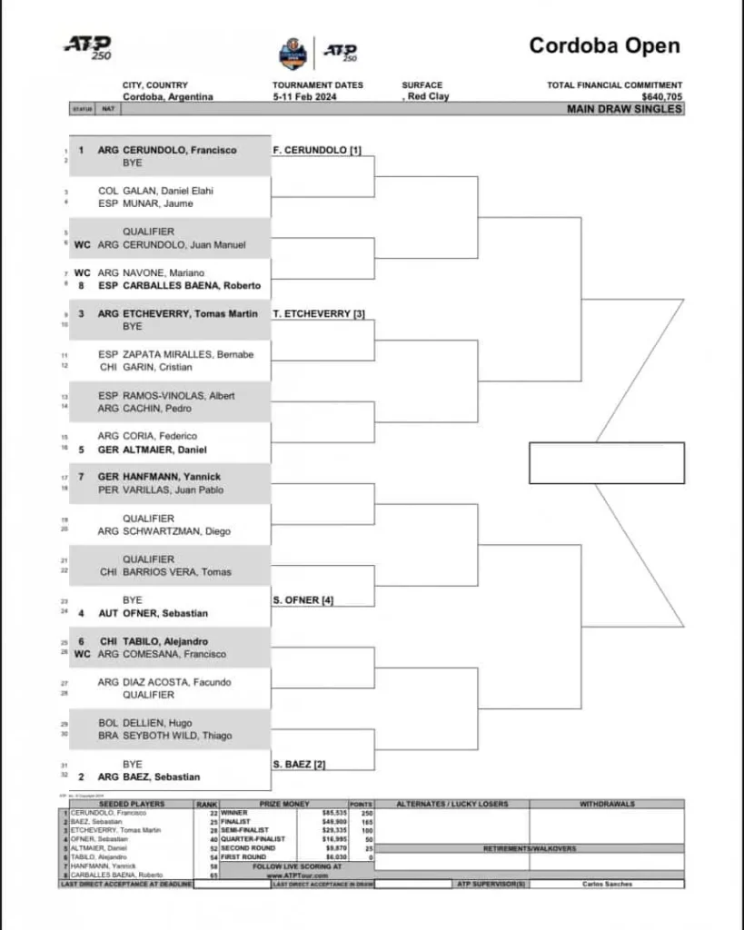 En primer lugar, cabe mencionar que los argentinos Francisco Cerúndolo (N22), Sebastián Báez (N25, campeón en 2023) y Tomás Etcheverry (N28), más el austríaco Sebastian Ofner (N40), partirán como favoritos y tendrán el beneficio de comenzar directamente desde la segunda ronda. Esto claramente favorece a los integrantes del equipo argentino de Copa Davis.