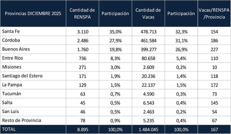En el cuadro superior se puede visualizar la distribución de tambos y vacas por provincia, al igual que la participación relativa y la cantidad de vacas por unidad productiva. El 91% de los tambos y el 95,7% de las vacas en producción se concentran en la Cuenca Central (Santa Fe, Córdoba, Buenos Aires y Entre Ríos).