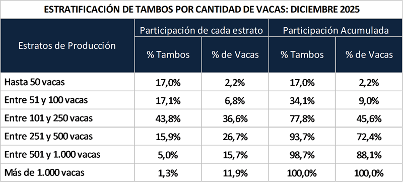 Abajo la estratificación en función a la cantidad de vacas, indicando la participación en función a la cantidad de tambos y luego de animales en producción. Como más significativo puede mencionarse que los tambos con más de 500 vacas totales en producción son sólo el 6,3% de los tambos, pero tienen el 27,6% de las vacas y aportan más de un tercio de la producción total de leche. En el otro extremo se encuentran los tambos de menos de 100 vacas totales en producción que son el 34,1% de los tambos, tienen el 9,0% de las vacas y generan menos del 10% de la producción total.