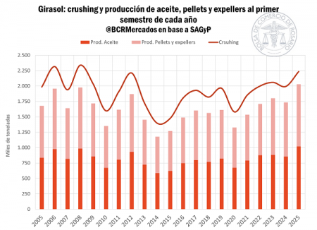 Con 2,2 millones de toneladas de girasol procesadas en el primer semestre, la molienda alcanzó su máximo desde que hay registros de SAGyP (2005), superando el millón de toneladas en producción de aceite y harina.