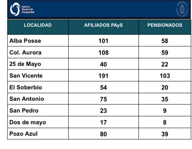 El análisis por localidades refuerza las sospechas: San Vicente concentra 191 afiliados y 103 pensiones, Colonia Aurora 108 afiliados y 59 pensiones, y Alba Posse 101 afiliados y 58 pensiones. En todas ellas, la proporción entre afiliación política y cantidad de beneficiarios excede por mucho los promedios esperables, lo que indica una lógica de distribución de pensiones como herramienta de control y fidelización política dentro del partido. Lejos de ser una política de inclusión, el esquema funcionaría como un mecanismo de clientelismo sostenido con dinero público.