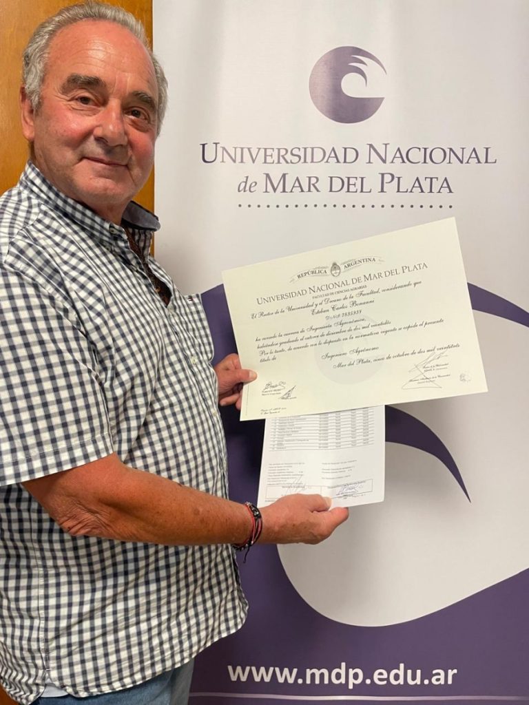 “Luego de la pandemia, un amigo de mi hijo me dice: mira que están terminando muchos que habían abandonado y que hay opcionales. Y así fue que 36 años después volví a la Facultad para averiguar si podía terminar. Para mi sorpresa el plan lo permitía, pero nuevamente tenía que cursar algo nuevo, en este caso Inglés y en la era de la tecnología, me costó mucho pasar de aquel microscopio a las pantallas”, confiesa. El segundo paso fue encontrar un tutor de Tesis (Roberto Álvarez) y el tema: finalmente realizó la tesis con un trabajo sobre cultivo de papa ecológica, sin químicos, sin riego artificial. Finalmente Esteban se recibió de Ingeniero Agrónomo en el año 2024 a sus 75 años. De su acto de colación participaron algunos de sus hijos, su nueva esposa y su nieto.