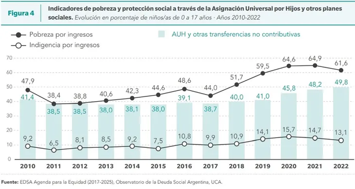 Por lo tanto, la pobreza infantil se sostiene en niveles similares a los de 2019, el momento previo a la pandemia, donde alcanzó el 59,5% de los NyA. En medio de la crisis del Covid-19, esos valores tocaron máximos de 64,6% (2020) y de 64,9% (2021).