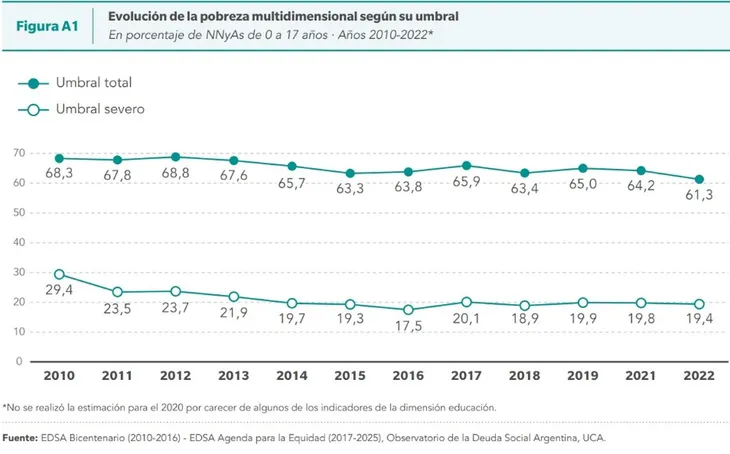 Este dato, al que accedió Ámbito, surge del reciente informe publicado por el Observatorio de la Deuda Social Argentina de la Universidad Católica Argentina (UCA). El trabajo, realizado por el Barómetro de la Deuda Social de la Infancia, analiza la situación social estructural de niños y adolescentes de entre 0 y 17 años en Argentina, entre los años 2010 y 2022.