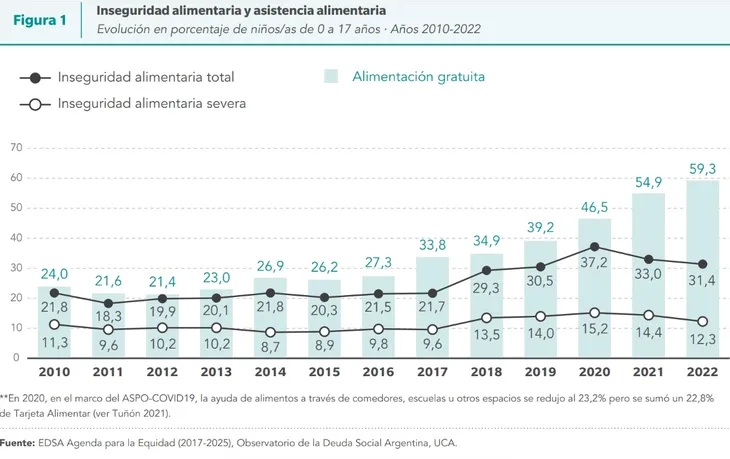 La alimentación es uno de los ejes del trabajo donde se observó una leve baja respecto a 2021. En concreto, el 59,3% de los NyA de Argentina reciben alimentos de forma gratuita, ya sea en la escuela, merendero o centro social, entre otros lugares.