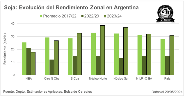 Por el lado de la soja de primera, los rindes fueron cercanos al promedio nacional, mientras que en el NEA se ubicaron en torno a los 17,9 qq/ha.
