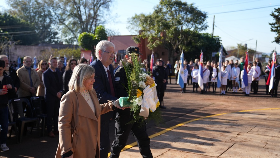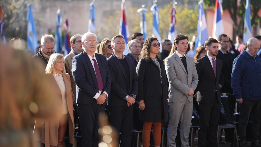 El acto fue encabezado por la Intendente María Eugenia Safrán acompañada de su Gabinete Municipal, el Presidente del Honorable Concejo Deliberante Artemio Tarnowski, Concejales, instituciones educativas, agrupaciones tradicionalistas, y pueblo en general.