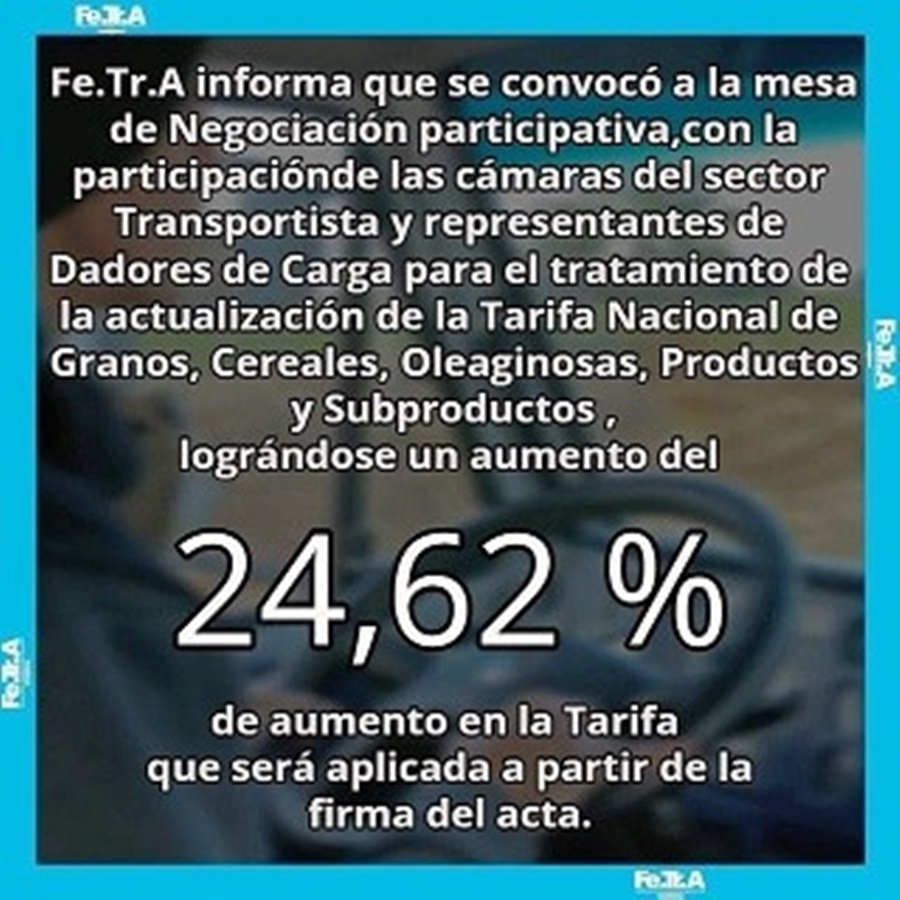 Esta tarifa, completó Coninagro, tiene vigencia a partir de este miércoles 13 de Marzo y supone un valor de arranque de 5.333,08 pesos por tonelada y kilómetro (gasoil grado 3 de referencia: 1.109 pesos).
