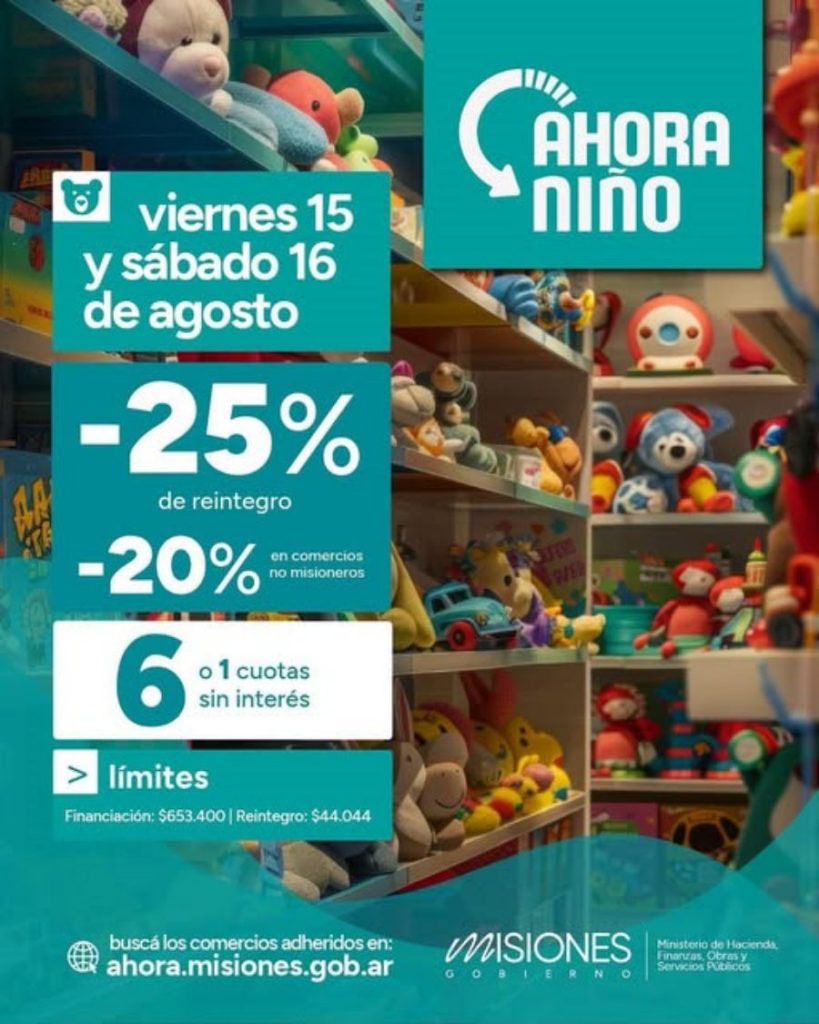 El Ministro de Hacienda de al provincia de Misiones, Adolfo Safrán se refirió sobre el Programa Especial Ahora Niño, "como informó el Gobernador Passalacqua, en el marco del Mes de las Infancias se realizará una nueva edición del Programa Especial Ahora Niño, que estará vigente los días viernes 15 y sábado 16 de Agosto en comercios de toda la provincia".